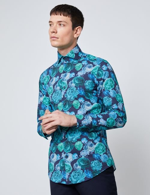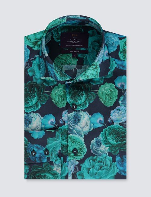 H & C Men Dark Turquoise Rose Shirt- Single Cuff, this men’s dark turquoise curtis shirt features a paisley print design and a distinctive high two button collar also designed with the modern man in mind. This Curtis shirt has been specially engineered to flatter your physique whilst maximizing comfort. In addition, it is crafted from cotton stretch fabric. The stretch slim fit is gently tapered across the waist and chest, creating a relaxed yet defined silhouette.