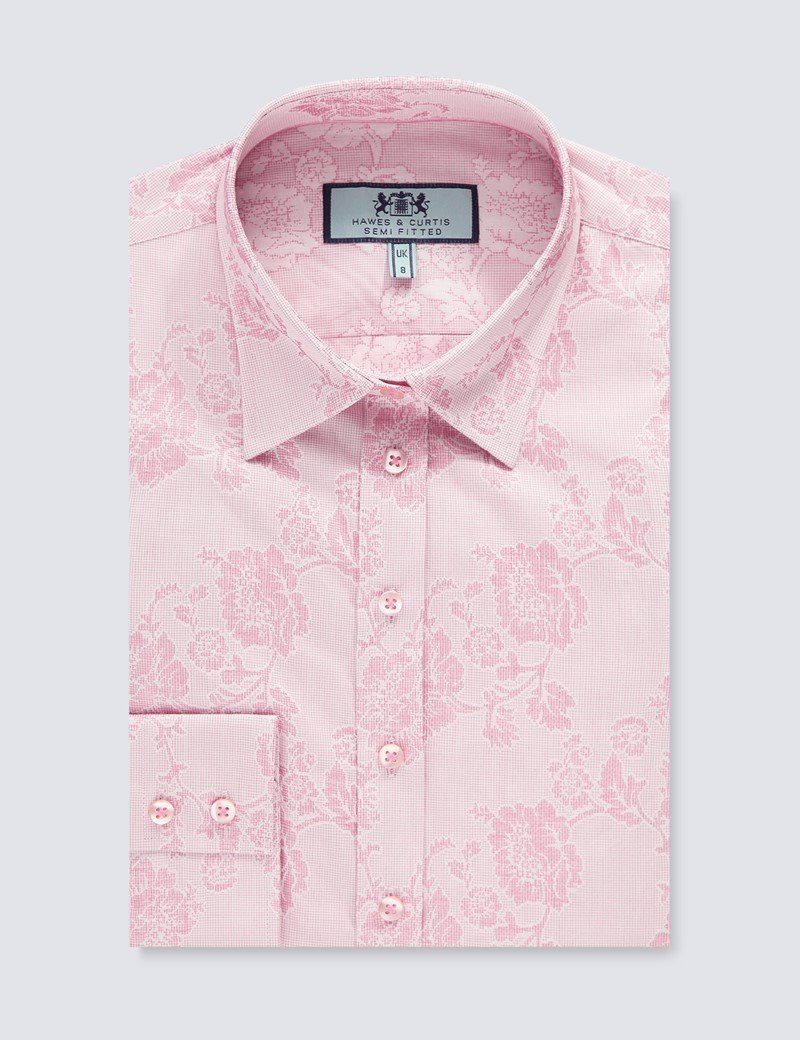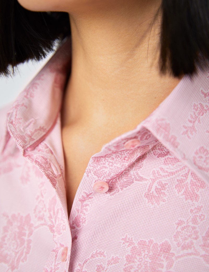 H & C Women’s Floral Jacquard Shirt is cut from luxurious cotton fabric. This stylish pink and light pink shirt features a floral jacquard design and single cuffs. In addition, this semi fitting shirt is closely cut at the bust and gently expands at the waist and hip.