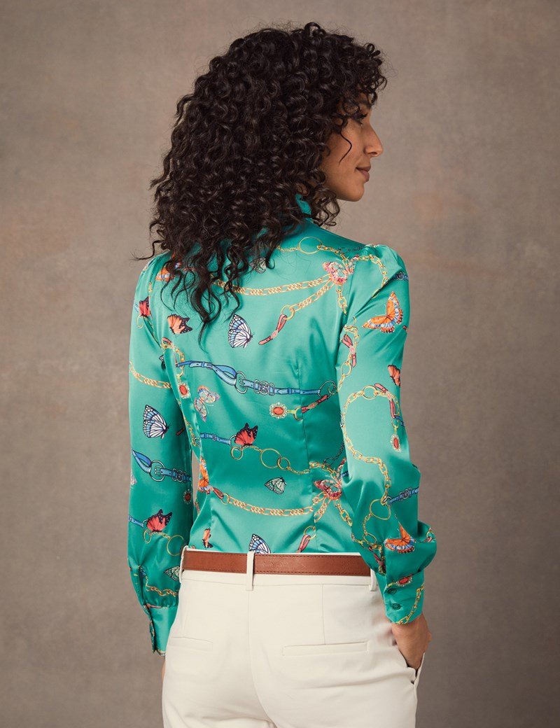 This elegant Hawes and Curtis Women Green Satin Blouse is fashionable and indulgent addition to any women’s attire. The bow adds a distinctive feature, offering a unique and eye catching aspect to your outfit. The bow is also self tied to allow for as large or small a bow as you wish.